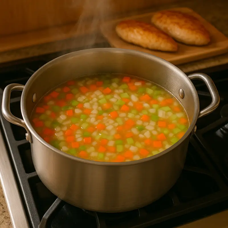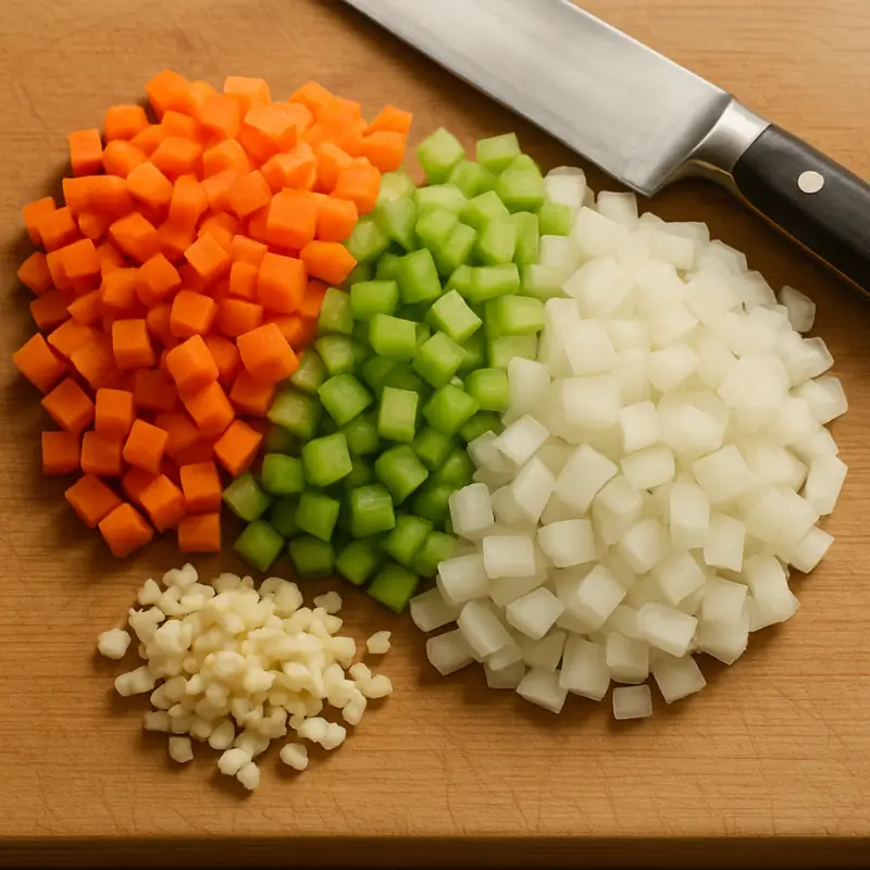 Dice the carrots, celery, and onions into bite-sized pieces. Mince the garlic finely.Uniformly cut vegetables ensure even cooking and a harmonious bite in every spoonful.
