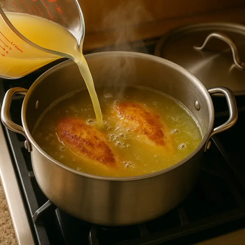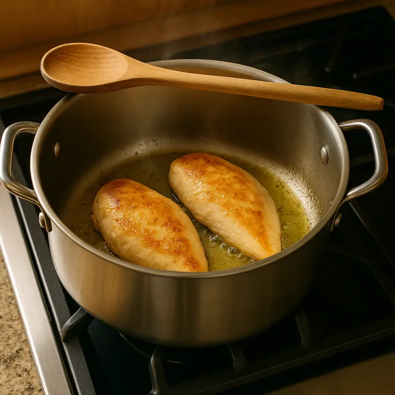 Heat a splash of olive oil in a large pot over medium-high heat. Add the chicken breasts and sear them until golden brown on both sides.Searing seals in the juices, keeping the chicken tender and flavorful. -