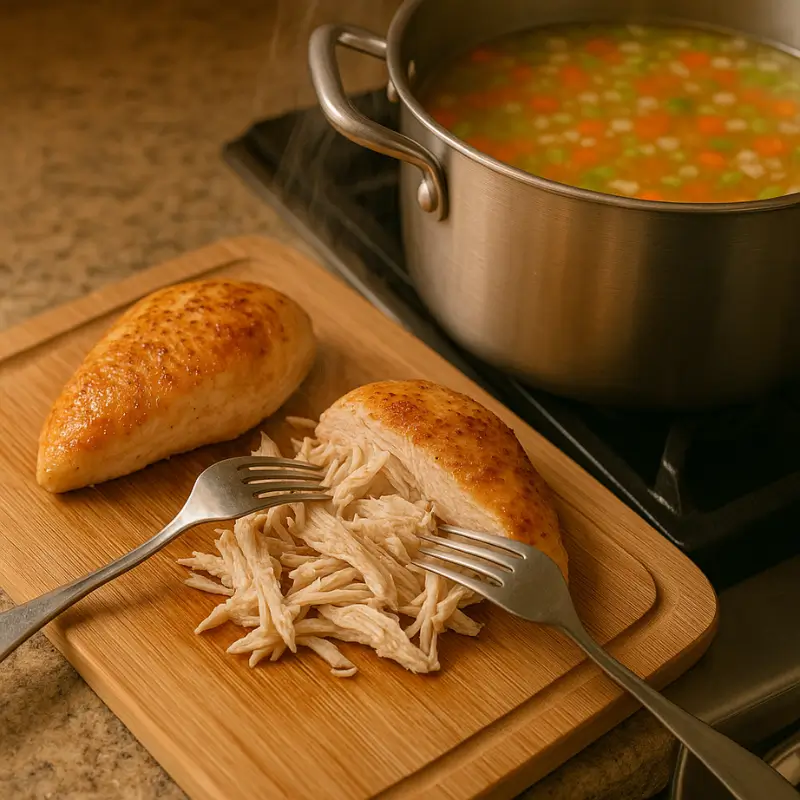 While the vegetables simmer, shred the chicken using two forks. Return the shredded chicken to the pot.Shredding the chicken creates tender pieces that easily soak up the flavors of the soup.